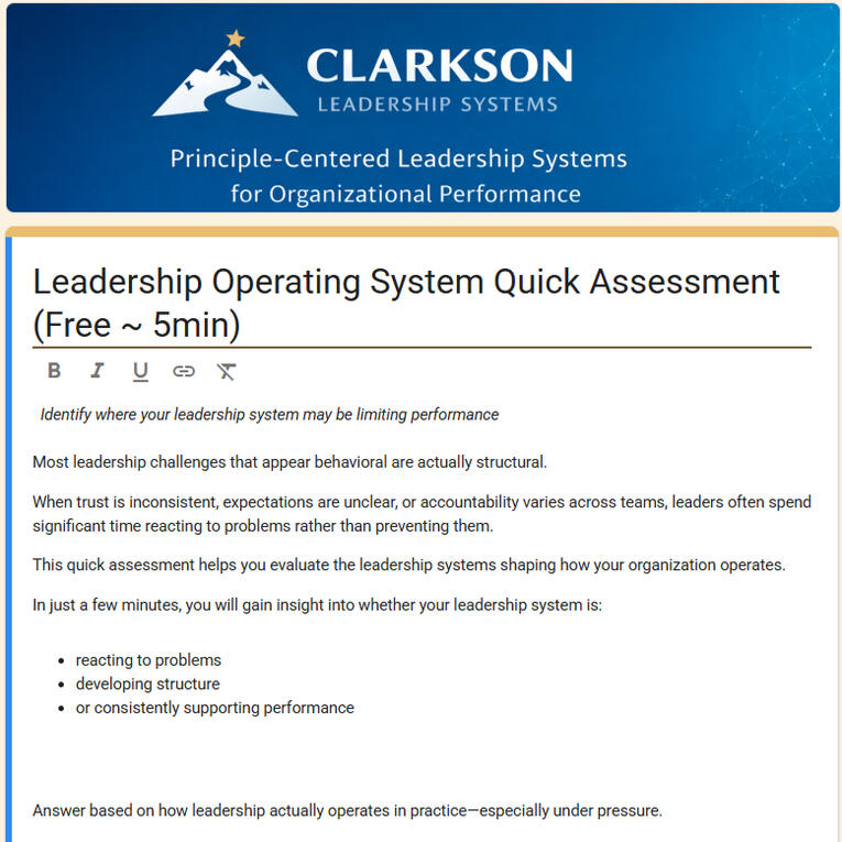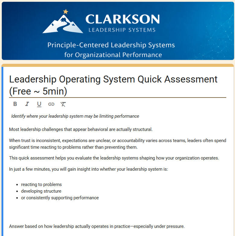 Most leadership challenges are not individual—they are structural.This 5-minute assessment helps you quickly evaluate the leadership systems shaping trust, clarity, and accountability in your organization.In just a few questions, you’ll gain insight into whether your leadership system is:reacting to problemsdeveloping structureor consistently supporting performance
